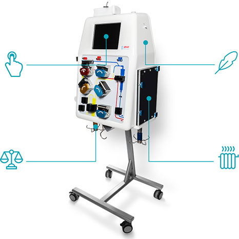 Ecran tactile, 5 pompes, 3 balances jusqu’à 8 poches de 5 litres chacune, réchauffeur, pousse seringue aussi disponible pendant le rinçage, enregistrement du rinçage, pré-dilution automatique, ratio pré et post-dilution visible durant le traitement ou pré-réglé, détecteur d’air, détecteur de fuite de sang, possibilité d’activer l’aiguille unique pendant le traitement, alarmes sonore et visuelle, indications pour résoudre les alarmes sur l’écran, enregistrement des profils, plus de 20 minutes de batteries, « bouton Take a break», Wi-Fi, vidéo de support et plus encore !